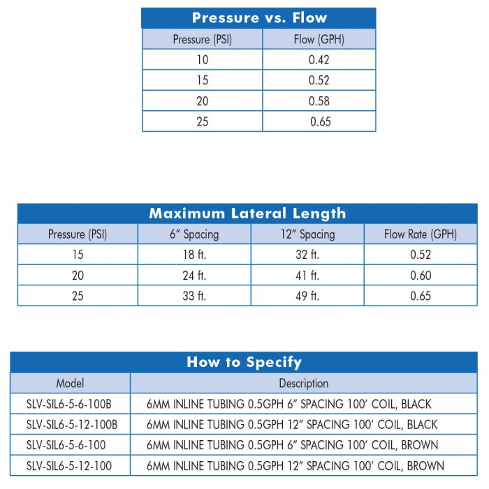 Inlet filter to prevent particles from entering emitter labyrinth. Turbulent flow, large labyrinth, and two outlets per emitter help prevent clogging. Flexible tuing for easy installation. Ideal for containers and narrow plantings. Use with lA` barbed fittings.