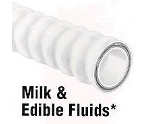 Hose for milk and edible fluids meet tough FDA sanitation requirements. FDA grade white latex rubber is used for lining and cover, offering a service temperature range of -20° F through 180° F. An optional high-temperature white chlorobutyl lining can be supplied for temperatures to 300° F for steam or chemical cleaning.