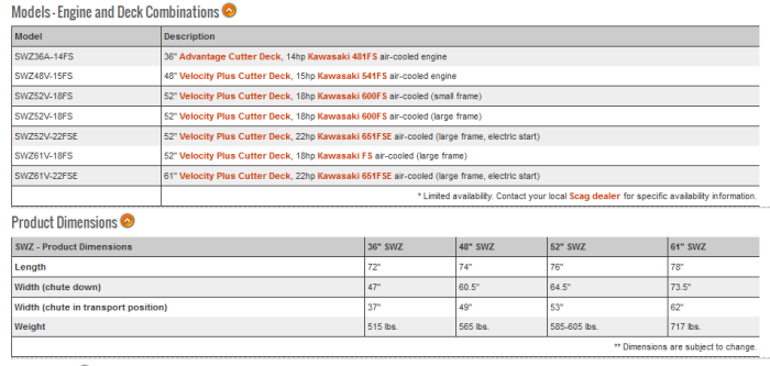 - Choose from a 36" Advantage™, or a 48", 52" or 61" Velocity Plus™ cutter deck. Scroll down for a complete list of engine and cutter deck combinations.
