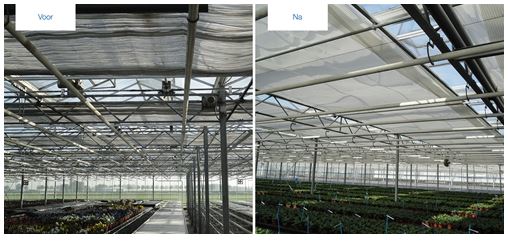 It is also possible to fit screens on the roof of the greenhouse. Various applications are possible. With a Venlo greenhouse a horizontal construction can be mounted in the gutter or on the ridge, to which the screen system is attached. With a wide-span greenhouse a deck roll screen can be fixed to the deck, which rolls from the ridge to the gutter. The advantage of an external screen is that the sun’s heat is held outside and not inside the greenhouse.