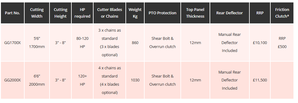 - GG1700X has a 5’6” cutting width and fitted with 3 chains or blades