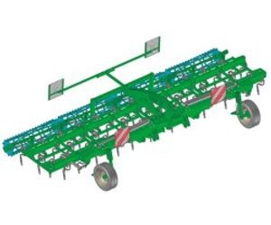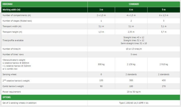 - For the standard, sensing wheels are available for width of 6 m and 9 m. The mechanically welded beam has been specially designed to be sturdy during the work and to make easier the trips thanks to a transport width of 3.10 m. It’s fitted with 5 vibrating tines rows and can be fitted with straight tines (45 x 12 or 32 x 12), or semi-straight tines (32 x 10). The work depth vary from 0 to 20 cm. A rotating harrow (diameter : 400 mm) hold in place the work depth of the equipment and break-up the work.