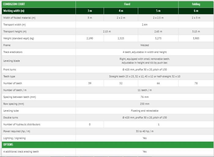 Concentrate of technicality in all simplicity, for the preparation of seed beds with association of teeth and turns. The COMBIGERM COURT is a simplification of the COMBIGERM on which the pressure elements, croskillettes or notched rollers, are replaced by the SYNCHROSPIRE roller with a diameter of 420 mm. The vibrocultor is more compact (4 rows of teeth), and the finishing is achieved by the association of a SYNCHROSPIRE with a croskillette. Its leveling and lifting action at the bottom of the seedbed promotes seed germination and gives regular emergence. The press elements can be modulated and replaced by a synchronized double turn. This is completed by a row of croskillettes.