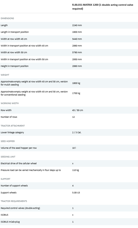 The latest generation of the MATRIX series impresses with its exact depth guidance, precise singling and depositing as well as convenient operation. The 12-row or 18-row mechanical precision seeder can be used for seeding beet, canola-seed and seed of root chicory. Thanks to the new parallelogram suspension, the seeding unit is guided precisely in the row and, thanks to the additional coulter pressure available, even in difficult soil conditions. The machine is suitable for conventional seeding (after ploughing) and mulch seeding (with reduced tillage), using a row width of 45 or 50 cm. A wide range of different caster wheels is available for various soil conditions.