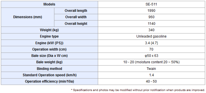 Operation and a maintenance are easy with a simple structure. The 50cm diameter and 63cm wide mini size bale is easy to handle.