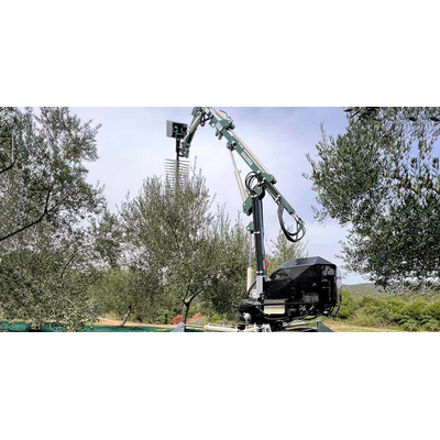This innovative harvester, equipped with a tracked self-propelled chassis, a telescopic articulated arm, and a PATENTED shaking comb, is operated from the ground by a single operator using a remote control. For