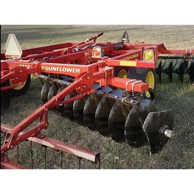 The Model 1212 Disc Harrow is Sunflower`s discing answer for America`s smaller farmers. It is available in rigid models only and matches tractor horsepower in the range of 110 and lower. With exception of gauge wheels the 1212 has all of the same outstanding features common to the 1233. It`s tough, heavy and capable of performing primary and finish discing operations. Like all discs from Sunflower, the 1212 truly meets the toughest standards, earning the label of America`s best built disc.