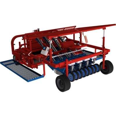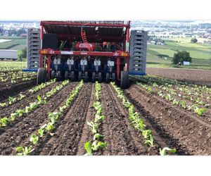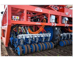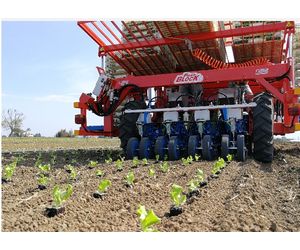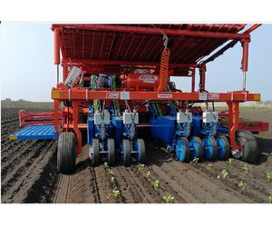Versions: 3 points - with draw-bar – self-propelled. Frame: single bed - multi-bed. Minimum inter-row spacing: 25 cm (9.8"). In-row spacing: electronically adjustable from 10 (3.9") to 99 cm (39"). Productivity h element: average 6,500 plants/h- maximum 7,500 plants /h. Main features: flex roller – electronic gearbox - row switch-off device – electronic adjustment for pincers opening.