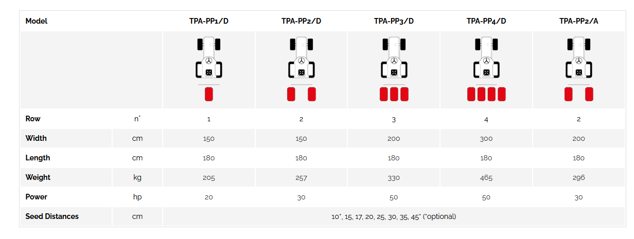 The distance between the rows is adjustable and the seeding distance can be varied from 17 to 45 cm.