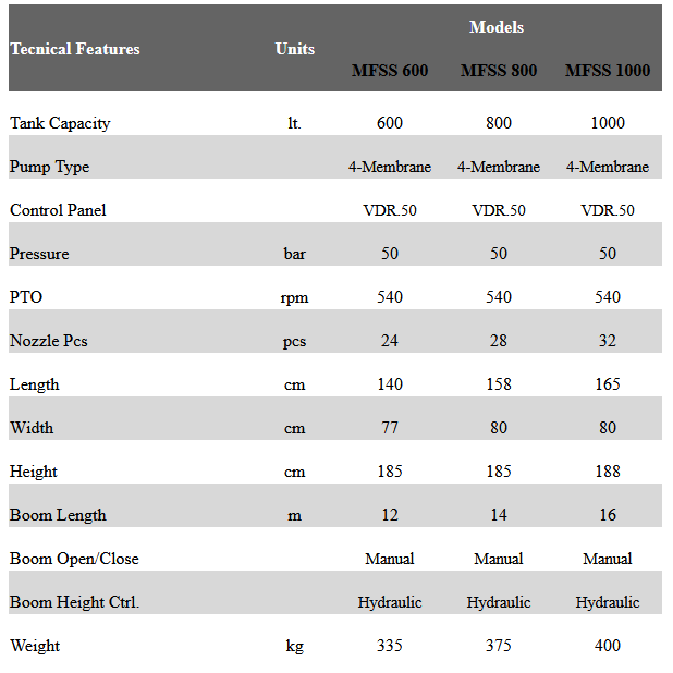 Tractor mounted sprayers by PTO via shaft developed to meet the different requirements of plant protection treatments. Sprayers extremely versatile and suitable, according to the applications, to operate in open-field cultivations, sprayer and distribute herbicides among the plant rows the availability of several mechanical and hydraulic spraying booms together with different equipments and option allow our sprayers to suit the requirement of the single users in the specific treatments. Easily mountable on 3-pt of tractors. Level indicator on the tank, Polythene tanks, Easily cleanable water filter, Booms are removable for loading and transportation, Easily adjustable and user friendly, High ar efficiency, Clean water tank, Pressure regulation.