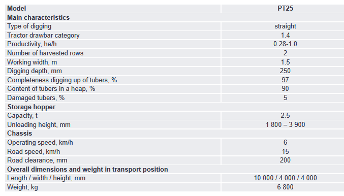 The semi-trailed potato harvester PT25 is designed for harvesting potatoes on light and medium soils, providing excellent separation of tubers from impurities, its careful collection in the bunker and subsequent careful unloading. This model of the harvester makes the process of harvesting potatoes very economical, rational and convenient, and the high productivity of the harvester makes it popular in farms where potato growing is actively developed. The PT25 harvester is aggregated with wheeled tractors of at least 1.4 drawbar category.