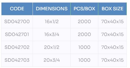 Code: SD042700. Dimensions: 16x1/2. Pcs/Box: 2000. Box Size: 70x40x15.