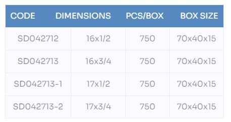 Code: SD042712. Dimensions: 16x1/2. Pcs/Box: 750. Box Size: 70x40x15.