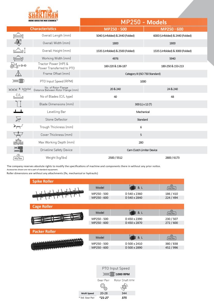 The MP250 power harrow range is specific for tractors with category 3 hitch from 160 HP to 250 HP and has a 5 and 6 m working widths. It is available with packer roller, cage roller and spike roller. It is designed for heavy duty soil bed prepara??ons in very wide areas.