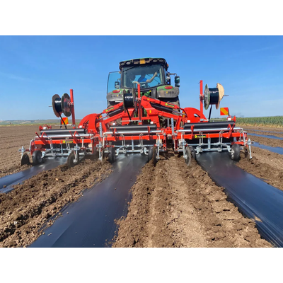 Best seller! Mulching machine with a front roller. Ideal for compacting the soil, laying the drip tape dispenser and the mulching film in one pass. Configurable with uncovering and ridging discs. Compatible with biodegradable film.