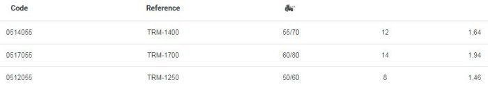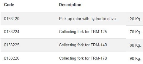 Technical features: 540 r.p.m. PTO speed = 2.035 r.p.m rotor speed. Shredding rotor: Belt side drive. Pick-up rotor (134 r.p.m.): chain side drive. Rotor with 07-type hammers. Depth control by pyvot tyre wheels. 3-point hitch category II. Gearbox with built-in free wheel. Pick up with automatic torque limiter.