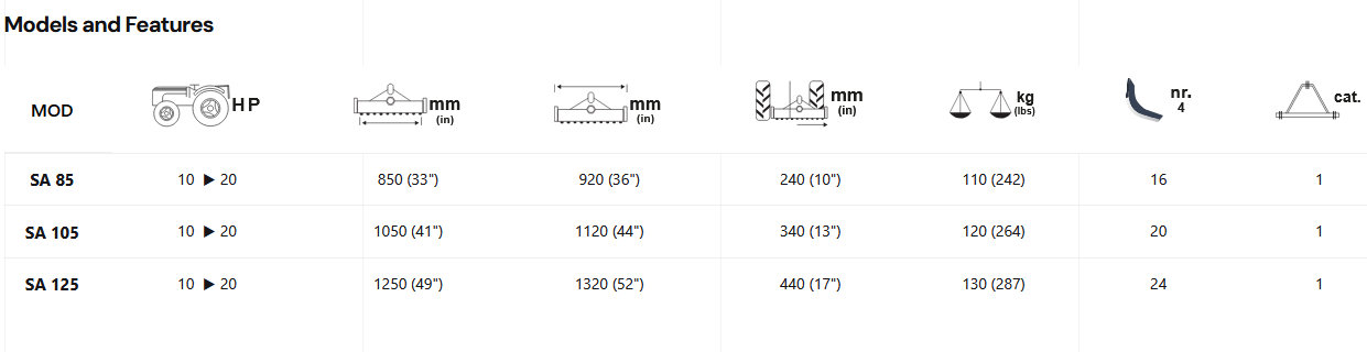 The SA model is the lightest tiller in the Sicma range and with its low energy absorption it can be used on tractors with powers of between 10 and 20 horsepower. Its manual lateral movement make it a very popular model; easy to manoeuvre and transport, it is suitable for light use.