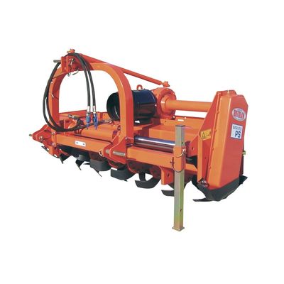 Rotary Tiller Series PS with Hydraulic Shifting For Tractors From 30 To 75 HP (22-55 KW). The rotary tiller Series PS is used for working the soil of vineyards and orchards and more generally for all those crops that require working between the rows. It is available in 4 models in different working sizes of 140, 165, 185, 205 cm. The sliding of the cutter body takes place on a chromed bar in order to avoid possible wear. Lateral transmission through the ASA 120 HE chain in oil bath, single speed 540 rpm reduction gear, automatic chain tensioner, safety clutch cardan, rotor with 6 blades per flange (helical or angled), depth adjustment slides , 2nd category universal hitch.