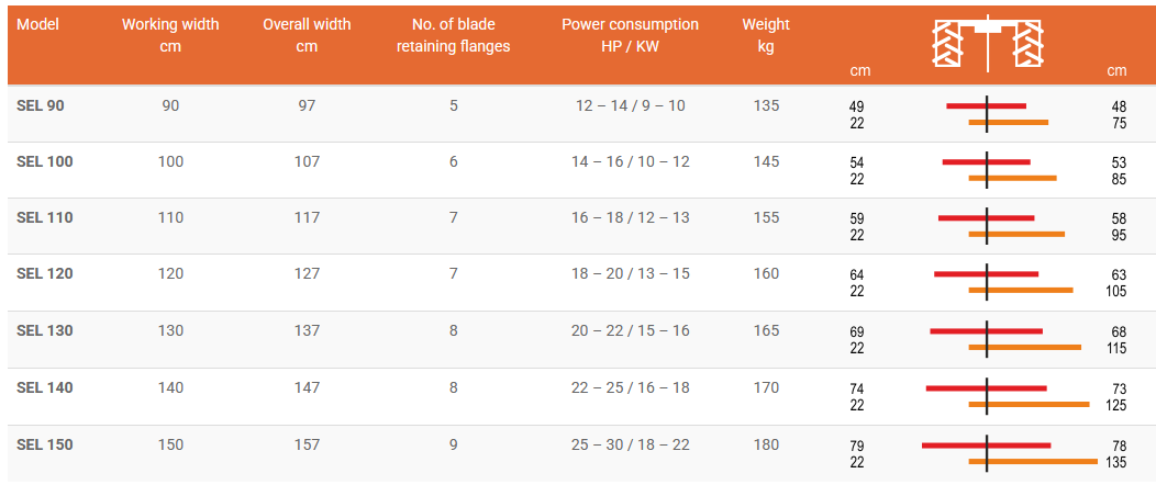 Rotary tiller with manual or hydraulic lateral movement for tractors from 12 to 30 HP - from 9 to 22 KW. Rotary tiller SEL is built to be applied to tractors with limited power; thanks to the mechanical position system or, on demand, hydraulic with sliding on chrome plated shaft, it can be used in position both central both decentralized. This lets you work easily even in sensitive crops. Lateral gear drive, the robust mechanics, the structure strong but lightweight place this machine in a significantly higher category.