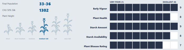 E44H12 R has strong seedling vigour for rapid stand establishment. This hybrid has moderate ear and plant height. Plants flower early for maturity and 1 day earlier vs MZ 1340DBR. Plants have above average tolerance to Goss’s Wilt and other leaf diseases.Stalks are strong throughout harvest. Ears are long and slender with very good grain quality. Husk cover is average and opens well. Position in and north of maturity zone for optimum performance.