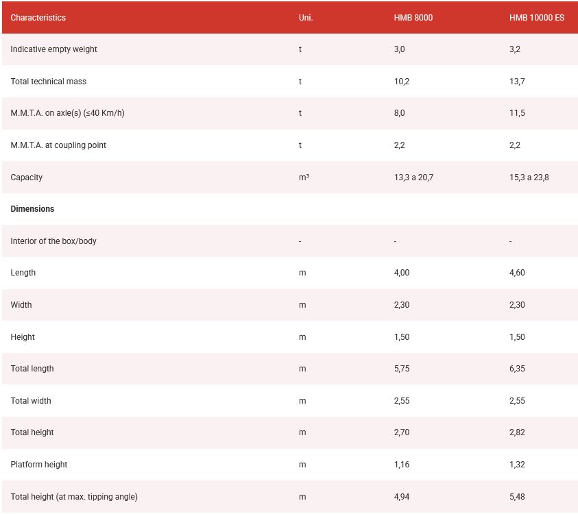 Characteristics: Frame made of Ferpinta® structural tube. Backwards tipping. Watertight sealed conical box with hydraulic door. Sprung drawbar (height adjustable) with Scharmuller® swivel flange ring eye. Folding hydraulic support leg. Front ladder and internal stairs. Toolbox