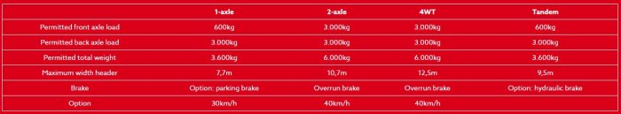 Explore the largest selection of header trailers on the European market. 4 different basic models are currently available: 1-axle, 2-axle, 4-wheel-turn and tandem trailers. Each model is available in different lengths, options and versions – custom-fit to the respective header being transported.