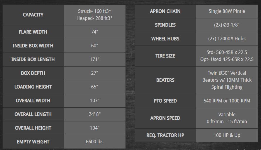 Stainless Steel & Solid Poly Box: Our box features a 1/2" thick High Density Solid Poly Floor and 3/4" thick Solid Poly sides for easy cleaning and minimal freeze up. Also, less friction means less force needed to pull the load off. Box flares and side panel retainers are made of SAE 304 Stainless Steel that resists rust and corrosion. This box is built to last! Vertical Beaters: The Twin Twister Vertical Beater is both versatile and tough, and offers a superior spread pattern compared to horizontal beaters. It features Twin 30" Diameter Vertical Beaters w/ 10MM Thick Spiral Flighting. Abrasion-resistant knives come standard, but may be replaced by any number of cups for finer materials and semi-solids. Expect consistent spread patterns of 30 - 40 feet in width. 540 RPM or 1000 RPM Input, 420 RPM Beaters.