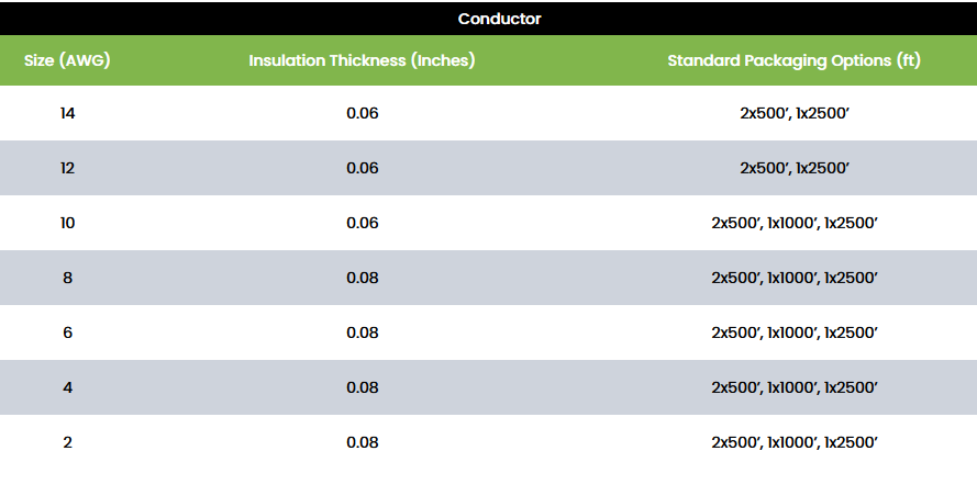 Conductor construction is soft drawn bare copper meeting the requirements of ASTM Specification B-3 and B-8. Gauge sizes 18 thru 8 are solid conductors. Sizes 6 thru 4/0 are stranded conductors.