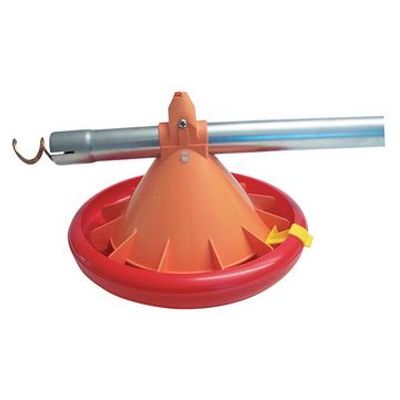 Allows feeding a larger number of broilers through the use of a single feeder thanks to a larger, 36 cm feeder pan. (65-80 broiler/feeder). The concealed threaded feed adjustment system underneath the feeder pan allows easy, quick and accurate feed level setting. The feeder lock allows the feed level to be kept at the required level. The patented single-bolt and nut pipe clamp system allows very easy assembly, disassembly and cleaning.