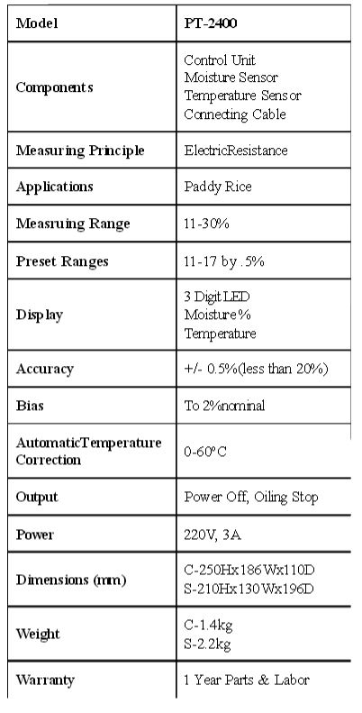 This simple-to-use device allows the user to maintain correct moisture content when drying paddy rice in a circulating dryer. Simply set the moisture control to the desired moisture content and turn the selector switch to the automatic mode. Using electrical resistance, individual kernels are captured in the sensor and their moisture content obtained. The dryer will be stopped when the grain moisture reaches the desired level. Correct drying will occur each time, optimizing production, while eliminating loss due to production errors.