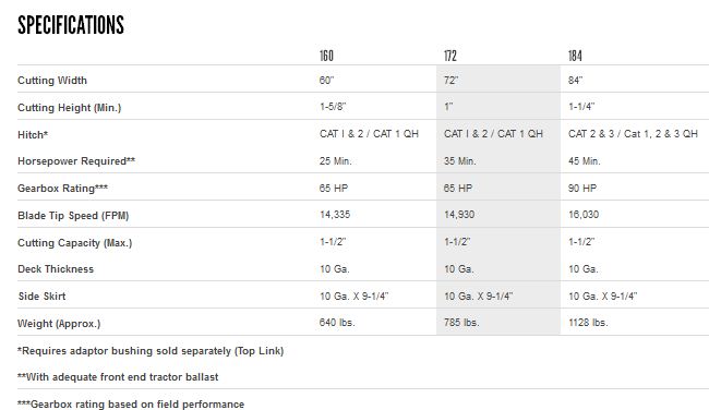 The 184 has a 84” cutting width and 1 1/2" cut capacity. It can be operated with a 45 HP tractor. A category 4 slip clutch driveline is standard, and the unit can be equipped with rubber deflectors or chain guards and a standard or quick hitch.