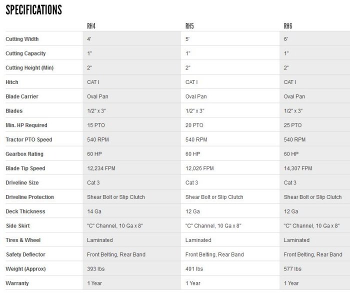 Rhino`s single spindle RH series is designed for use on 15, 20, and 25 PTO horsepower tractors. The round back deck and single tail wheel are designed for maneuvering around obstacles easily, and the oval pan blade carrier provides durability in tough spots for excellent mowing performance. The paint is powder coated for maximum durability and longevity.