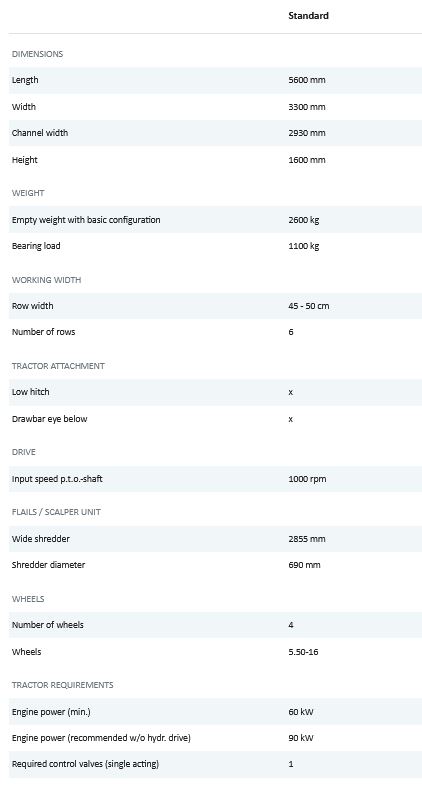 The defoliator type BM 300 is a six-row trailed defoliator equipped with a steel flail shaft and two cleaning shafts. The machine is mainly used in a so-called two-phase harvesting process for beets, chicory roots and celeriac. The leaf is chopped at full width of the machine and deposited Inline between the (beet) rows. Row widths between 45 cm and 50 cm resp. 18" and 20" available for the BM 300.