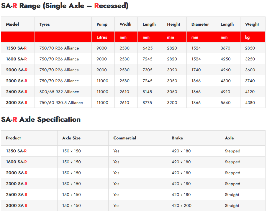 The capacities of the SA-R range from 1350 to 3000 gallons (6,137 to 13,784 litres). Sizes from 1350 SAR upwards to 2300 come standard on a stepped axle to dramatically lower the overall height of the tanker. Hi-Spec also uses Alliance tyres as standard on these sizes. Alliance tyres are considered premium quality radial for heavy-duty field and hauling jobs. All of the SA-R range is manufactured using 6mm high-quality British steel. Collared dished ends are inserted into the barrel, along with the addition of internal baffle plates and anti-implosion rings to give a strong finish. In addition, the double-folded chassis that supports each SA-R tanker in four key areas underneath the barrel is unique to Hi-Spec. This means that the entire underside of the barrel is fully supported across both the entire width and the length of the tank. This reduces stress on the barrel and helps to minimise weak points.