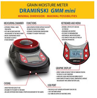 Measurement of the whole grains is performed using capacitive method. It is easy to fill the sample with the help of a dispenser. Large, legible graphic LED backlit screen shows full name of the species, moisture in %, average measurement and temperature of the grain. There is a digital temperature sensor in the chamber which guarantees accurate measurements.