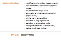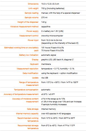 The moisture grain meter has default calibration for 33 kinds of grains, oil seeds, legumes and herbs with the following measuring ranges:
