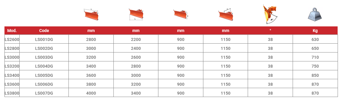 The LS series snow plough blades are characterised by their high quality, high performance and long life. These machines are built in special high-strength steel and are suitable for working in extreme conditions. These machines in their standard version are complete with: