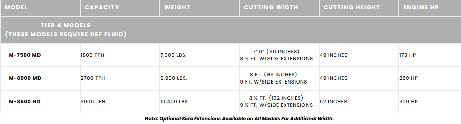 The following models are all self-contained with their own diesel motors. All "M" Series snowblowers mount on a front-end loader in place of the bucket and are controlled by wireless remote.