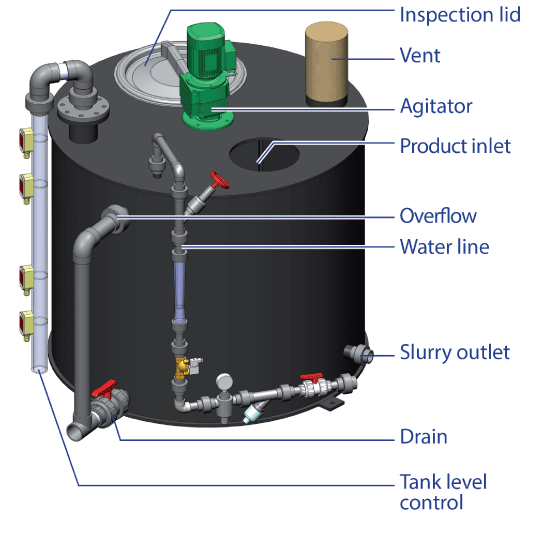 Each tank is designed and calibrated according to each application’s needs (taking into account slurry throughput, concentration, etc) in order to create the best custom solution. The upstream dry chemical feed system is also calibrated according to these requirements.