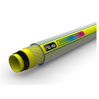 A soft and manageable garden hose in yellow colour. STRUCTURE: hose with a 6-layer structure, with a yellow interior, an anti-algae black layer, a yellow intermediate layer, NTS mesh reinforcement, transparent outer covering, SKY TECH film with special anti-UV formula that prevents ageing and gives the hose a special satin finish. The look of the hose is made even more captivating by a special new design.