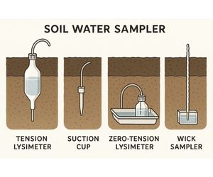 Soil water samplers, also known as soil solution samplers, are devices used to collect water from the soil for analysis. Such analysis can be performed onsite or by a lab. This water (soil solution) contains nutrients, salts, and other dissolved substances that are available to plants. By sampling this water, researchers and farmers can monitor nutrient availability, fertilizer efficiency, pollution levels, and general soil health.1. Tension Lysimeters (Porous Ceramic Cup Samplers) is inserted into the soil and connected to a vacuum. The vacuum draws water through the porous ceramic material into a collection tube. This is simple, relatively inexpensive, and reusable.