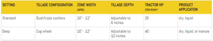 Deep Tillage: A large 30-inch diameter cog wheel with replaceable iron tillage bits fractures the soil up to 12 inches deep. It is followed by two 25-inch serrated coulters that contain the soil in the zone. These containment coulters are the largest in the industry and can be adjusted for width, position and angle. A removable gauge wheel helps provide depth control.