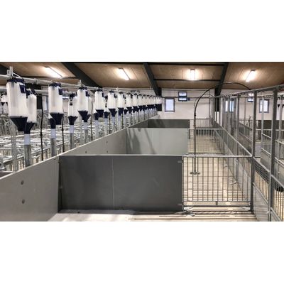 Penning made of a combination of panel and steel bars are 100 or 110 cm high. The panel is a 12 mm solid plastic sheet in the bottom enforced by a steel frame and provided with vertical steel bars at the top. The panel is attached to floor with strong 50 x 50 mm steel posts. The panel might also be provided with 210 cm high steel post connected to a 1 ”galvanized pipe. This solution is used where increased stability is required such as in pens for boars. Steel grids allowing pigs contact with other pigs in neighbor pens might be provided for this solution.