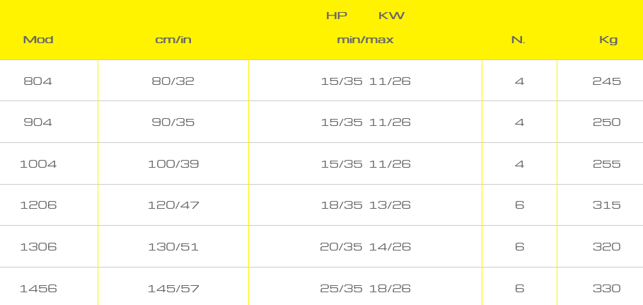 General characteristics of spading machines: - facilitating soil drainage and reducing the risk of slope runoff since that hard sole is not created under the tilled soil, a negative feature of other rotary or trailed implements. - tilling is done evenly across the width of the machine by evenly turning the soil so that fertilizer, manure or stubble can be buried. - the tilled soil has a flat surface, and the clods are of regular size so much so that sowing can often already be done directly. - the tools enter the soil one at a time, which allows for minimal tractor energy use and their durability is longer because they only work as they descend. - the spader is not towed by the tractor; on the contrary, it aids its advance so much so that this is the only implement that can work in wet soils because the tractor does not risk getting bogged down (since the demand for tractor wheel traction is minimal) and, in sloping terrain, in addition to helping the tractor advance, it keeps it in a stable position. It also reduces fuel consumption compared to traditional tillage such as plowing, ripping, and milling. - does not form the compact, impermeable soil layer underneath that prevents both greater root development and regular water runoff, so it does not trigger, especially on hillsides, dangerous slippage of tilled soil. - always ensures that clods are turned over and thus allows both faster aeration of the soil and the elimination, right from the roots, of harmful weeds. - requiring no tractive or braking effort from the tractor, it can be used even on steep slopes without any problem and in complete safety.