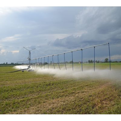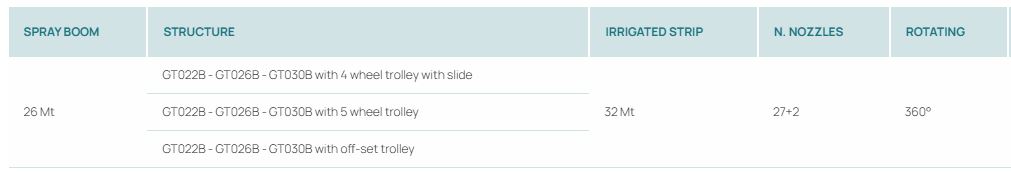26-metre spray boom system for agricultural irrigation. With standard trolley, 5 wheels or with off-set trolley.