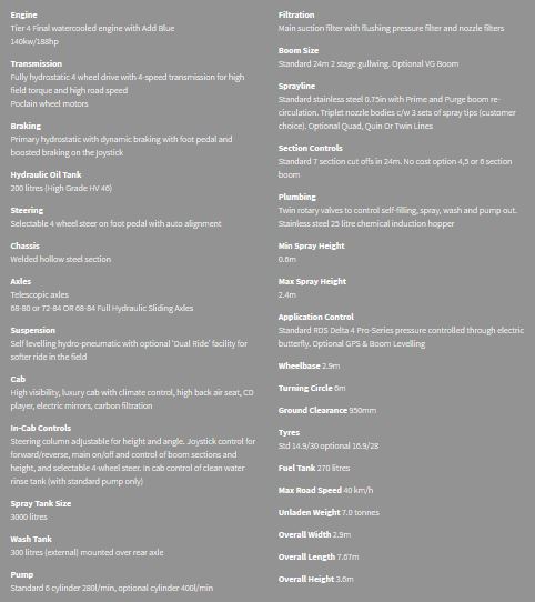 Power is from the latest Deutz Tier 4 Final, 6-cylinder turbocharged engine driving through Poclain Boosted Braking wheel motors. These are now fitted with Dynamic and Boosted brakes on the front axle for improved stopping capabilities when travelling at higher road speeds. All models benefit from a ‘load sensed’ hydraulic system which allows all operations to be carried out at low engine revs, reducing fuel usage and enabling swifter control of booms when spraying. It also allows a fast fill pump to be used in conjunction with the spray pump to give quicker filling whilst still being able to draw clean water through the induction hopper. Boom folding and unfolding is smooth and quick and enables booms to be folded in unison even on sloping ground.