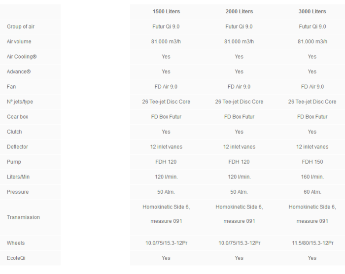Group of air Futur Qi 9.0. Air volume 81.000 m3/h. Air Cooling® Yes. Advance® Yes. Fan FD Air 9.0 N° jets/type 26 Tee-jet Disc Core. Gear box FD Box Futur. Clutch Yes. Deflector 12 inletvanes. Pump FDH120. Liters/Min 120 l/min.. Pressure 50 Atm.. Transmission HomokineticSide 6, measure 091. Wheels 10.0/80.12-10Pr. EcoteQi Yes.