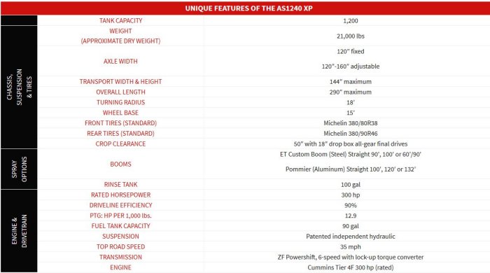 Ultimate Horsepower and Maximum Capacity; With a staggering 300 horsepower Cummins Tier 4 engine, and 1200 gallon spray tank the AS1240 XP provides the ultimate power and maximum spray capacity without the heavy weight. The AS1240 XP also features a heavier-duty differential from JCB to accommodate the increase in power to the ground.