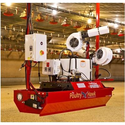 Sprayer: Piggyback on the Poultry Hawk® or pull it in a wagon. Powered by a 12-volt battery. Portable. 12-gallon capacity. Changeable nozzles. Up to a 40-foot swath. Spray: Vaccines, disinfectants, and insecticides.