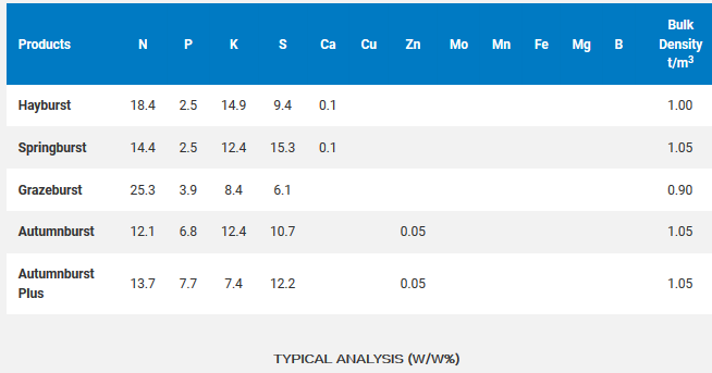 Sulfur in plant available sulfate sulfur form. Ideal ratios of nutrients to suit every pasture composition. Hayburst and Springburst provides N,P,K,S and trace elements in one pass. Spring application boosts bulk and quality of hay and silage. Grazeburst is ideal for boosting feed to take advantage of niche livestock activities.